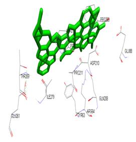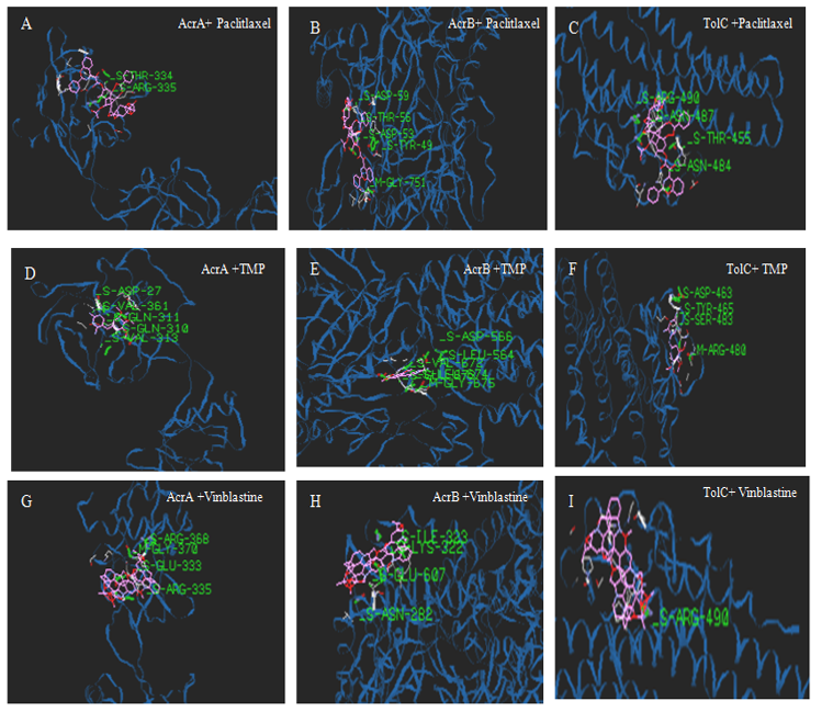 Fig. 4: Docked poses of paclitaxel, vinblastine and trimethoprim with efflux pump subunits AcrA, AcrB and TolC of Salmonella Typhi by iGEMDOCK. Efflux subunits are represented in blue whereas drug ligands are shown in pink. Number of amino acids involved in docked poses has been represented in green