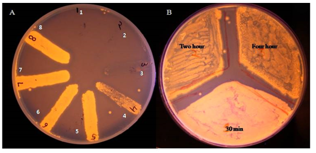 Fig. 5: Evaluation of efflux pump activity of anticancer and antibiotic drug combination EtBr cartwheel assay, Plate A: EtBr containing MHA plate showing the result of induced Salmonella Typhi after its treatment with trimethoprim alone (Spoke 1-4 at 0.5,0.375, 0.25 and 0.125 MIC), vinblastine alone (spoke-5), paclitaxel alone (spoke-6), induced S. Typhi (spoke-7), Uninduced S. Typhi (spoke-8). Trimethoprim registered growth of S. Typhi culture at only 0.125 MIC (spoke-4), whereas the bacteria failed to grow at 0.5, 0.375, 0.25 MIC. Imperceptible change in fluorescence intensities were observed in vinblastine alone, paclitaxel alone, induced and uninduced S. Typhi
