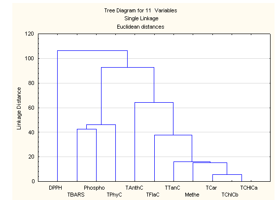 Fig. 2: It shows the Euclidian linkage distances amongthe chemical features and antioxidant properties of samples. The graphic was analyzed at 60 of linkage distance. The phytochemical features and the antioxidant properties were separatedinto 4 groups, according to the proximity of correlation