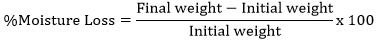 The percentage moisture loss was performed to determine the integrity of the ocular film at dry conditions. Three concerts from each batch were chosen randomly, weighed, and kept in the desiccator containing anhydrous calcium chloride. After 3 d, the ocuserts were withdrawn and weighed again. The percentage moisture loss was determined by the formula: