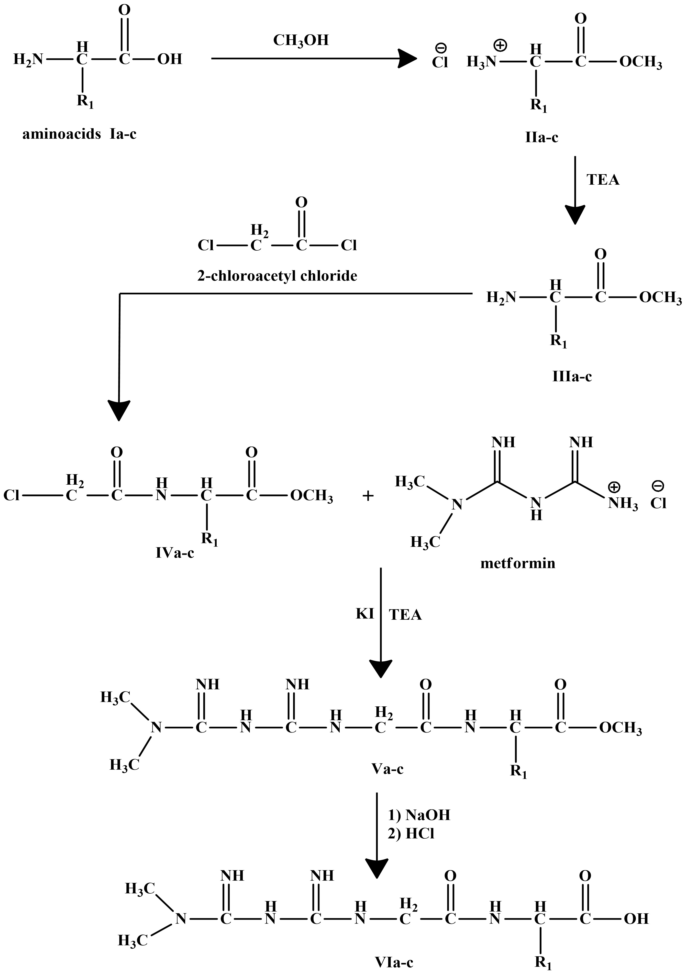 Methanol (50 ml) was added to the oily product of Metformin–amino acid ester compound V a-e (0.005 mol). The reaction was cooled down to 18 °C, and then sodium hydroxide (1N, 5 ml) was added dropwise, with continuous stirring over a period of 30 minutes. Stirring was continued at 18 °C for additional 5 h. The reaction mixture was acidified with HCl (1N, 5 ml), and then the excess of cold water was added. Methanol was evaporated under reduced pressure, and the acidic compound was precipitated [19].