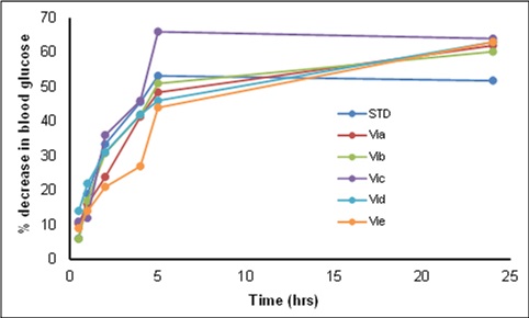 Fig. 4: Percent decrease in blood glucose level with time for metformin (STD) and (VI a-e) finals. Each value represents the mean of six animals
