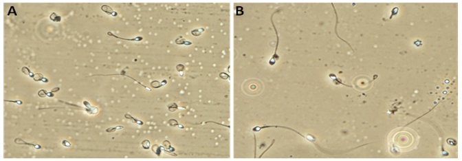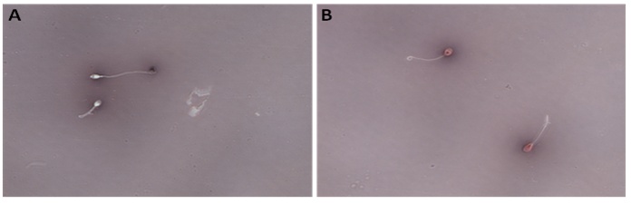 A. Control, B. Treated (100 mg/ml). Dead spermatozoa with damaged plasma membrane stain pinkish violet and the live ones remain unstained (400 x magnifications).