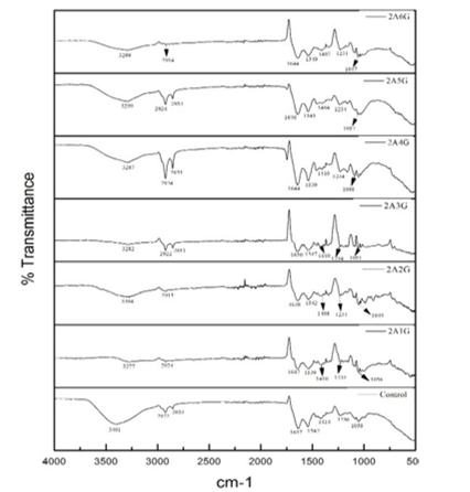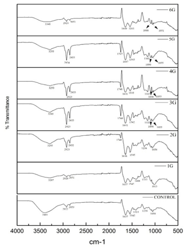 The structural, as well as functional information value, were conveniently obtained by the shifts in peak position [11]. Important functional groups such as proteins, lipids, ester, amide and nucleic acids can be validated via FTIR.