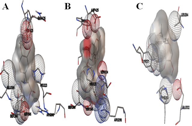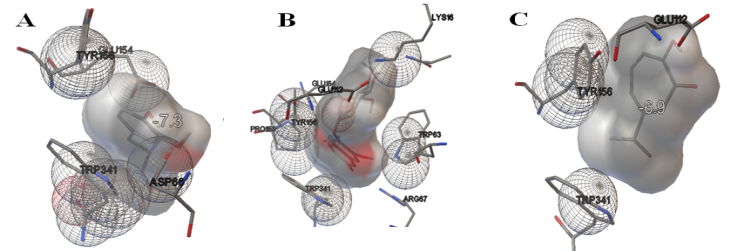 Fig. 2: The fig. showing active site interactions between dopamine D3 Receptors and ligands. A. Between dopamine D3 Receptors and levodopa B. Between dopamine D3 Receptors and esculin C. Between dopamine D3 Receptors and hinokitol