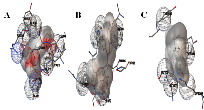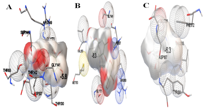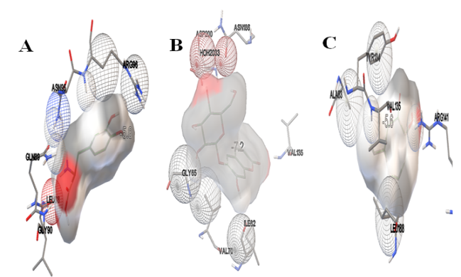 Fig. 3: The fig. showing active site interactions between glycogen synthase kinase-3-beta and ligands. A. between glycogen synthase kinase-3-beta and levodopa B. between glycogen synthase kinase-3-beta and esculin C. between glycogen synthase kinase-3-beta and hinokitol