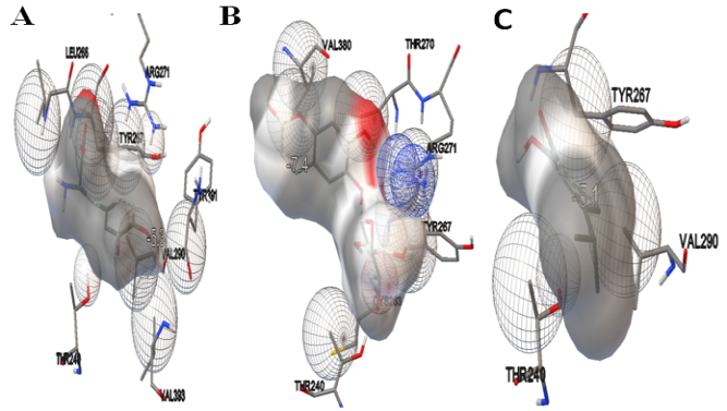 Fig. 4: The fig. showing active site interactions between mono oxidase B and ligands. A. between mono oxidase B and levodopa B. Between mono oxidase B and esculin C. Between mono oxidase B and hinokitol