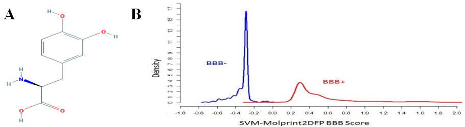 Fig. 13: Blood brain barrier permeability scores for levodopa. A. Pub Chem 2D structure of levodopa. B. Graph showing BBB permeability score of levodopa