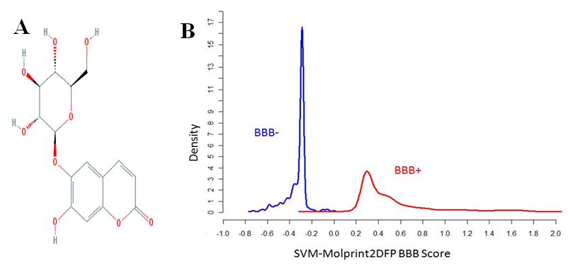 Fig. 14: Blood-brain barrier permeability scores for esculin A. PubChem 2D structure of esculin B. graph showing BBB permeability score of esculin