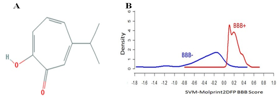 Fig. 15: Blood-brain barrier permeability scores for hinokitol A. Pub Chem 2D structure of hinokitol B. graph showing BBB permeability score of hinokitol