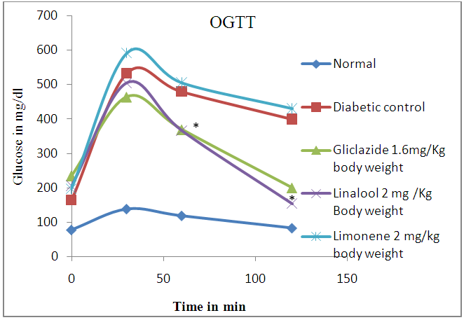 For conducting the OGTT, rats were fasted overnight with free access to water. Initial blood glucose of each rat was measured. All rats were fed orally with glucose load of 3 mg/g body weight. They were divided into five groups (n=3) as normal control, diabetic control, positive control (Glicazide 1.6 mg/kg body weight), diabetic rat with linalool and the diabetic rats with limonene. Blood samples were withdrawn from the tail vein at intervals of 30, 60 and 120 min of glucose administration. Glucose levels were estimated with glucose oxidase-peroxidase (GOD-POD) method using commercial kit (BIOLAB Diagnostics).