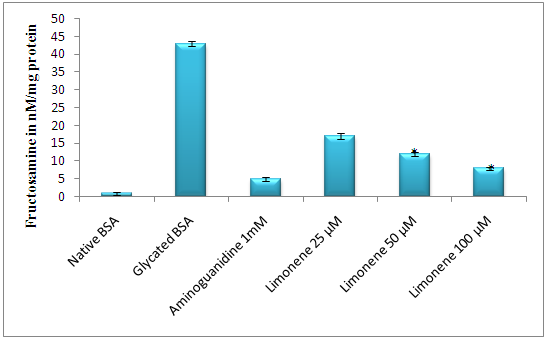 Fructosamine content is used as a measure for short-term control of blood glucose level in diabetic patients. Fig.3 shows the in vitro inhibition of fructosamine formation. It can be observed that limonene can reduce the fructosamine formation in a dose dependent manner. The dose at 100 µΜ is comparable to the positive control aminoguanidine at 1 mM concentration (showing a tenfold reduction in inhibitor concentration) aminoguanidine is known to act as a competitive inhibitor of protein glycation and can mop up the dicarbonyls formed [26]. Limonene on the other hand is known to inhibit protein glycation through stabilization of protein structure and preventing alpha beta transitions [13].