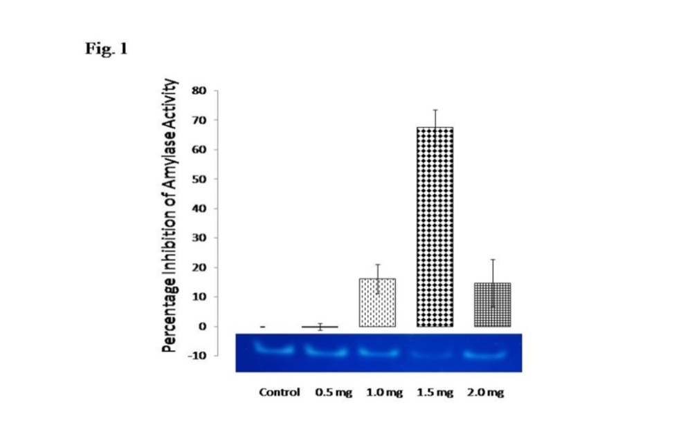 The amylase activity can also be detected by running PAGE with 7.5 % gel under basic native conditions. Five lanes were used, named as positive control (saliva only) lane, 0.5, 1.0, 1.5 and 2.0 mg/ml plant extracts containing lanes with saliva in each. Sample mix of 50 µl saliva and 50 µl of plant extract was made for loading in the wells, but in the positive control, 50 µl of distilled water in place of the extract was added to make equal volume as per the other treatment lanes and labelled as control lane. For zymogram, after electrophoresis, the gel was incubated in gelatinized starch (2 % prepared in 0.1 M sodium acetate buffer, pH 5) for 1 h. Subsequently, the gel was stained with iodine reagent (3 %) for 5 min. The gel was destained by dipping it in destaining solution (5 ml glacial acetic acid, 45 ml of methanol and 50 ml distilled water) for overnight and observed on the next day for better band detection [8]. Image J software (National Institute of Health, USA) would be used to analyse the percentage inhibition of the enzyme in the zymogram.