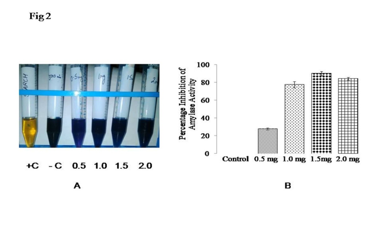 The achromic point of salivary amylase helps in determining the activity of the enzyme by taking starch as a substrate which reacts with 1 % iodine solution. 1 ml of an extract of different concen-trations (0.5, 1.0, 1.5 and 2.0 mg/ml) was taken on labelled test tubes and 1 ml of saliva with 1:20 dilution was added. The reaction was started by the addition of 1 ml starch and incubated for 15 min at 25 °C. The control test tube was prepared by stopping the reaction with 2–3 drops of iodine solution to it. Positive control of salivary amylase was prepared by incubating the test tube for 15 min containing untreated saliva with 1 ml of distilled water. The reaction was stopped by adding 2–3 drops of iodine solution [9]. The colour change was observed, and Image J software (NIH, USA) would be used for analysis of percentage inhibition of the enzyme.