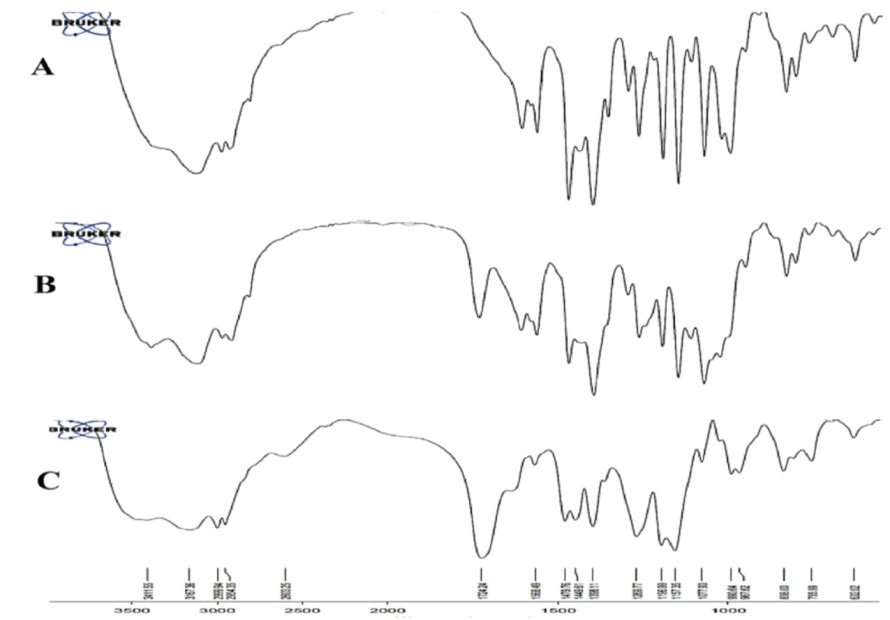 Fig. 1: Infrared spectra of A. pure EMT B. mixture of EMT+HPMCAS C. mixture of EMT+HPMCP HP-55