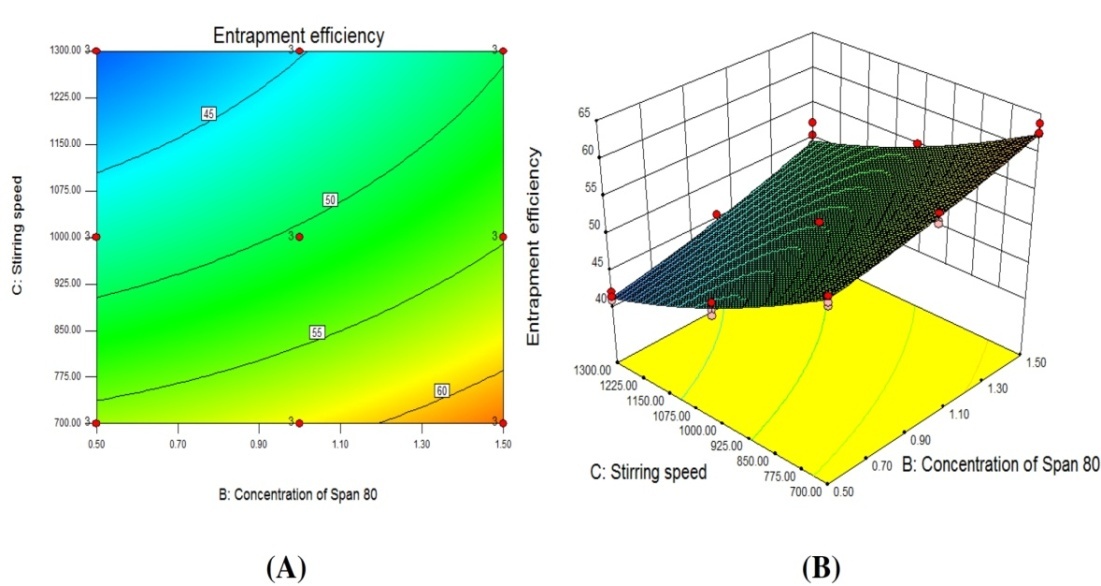 Fig. 3: (A) Contour Plot and (B) 3D plot showing effect of concentration of span 80 and stirring speed on % entrapment efficiency