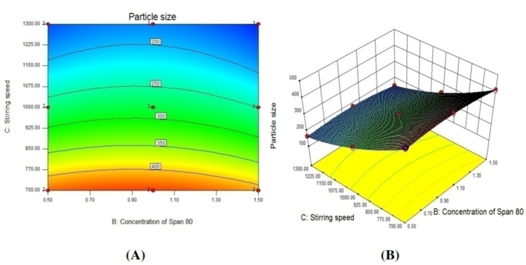 Fig. 4: (A) Contour plot and (B) 3D plot showing effect of concentration of span 80 and stirring speed on particle size