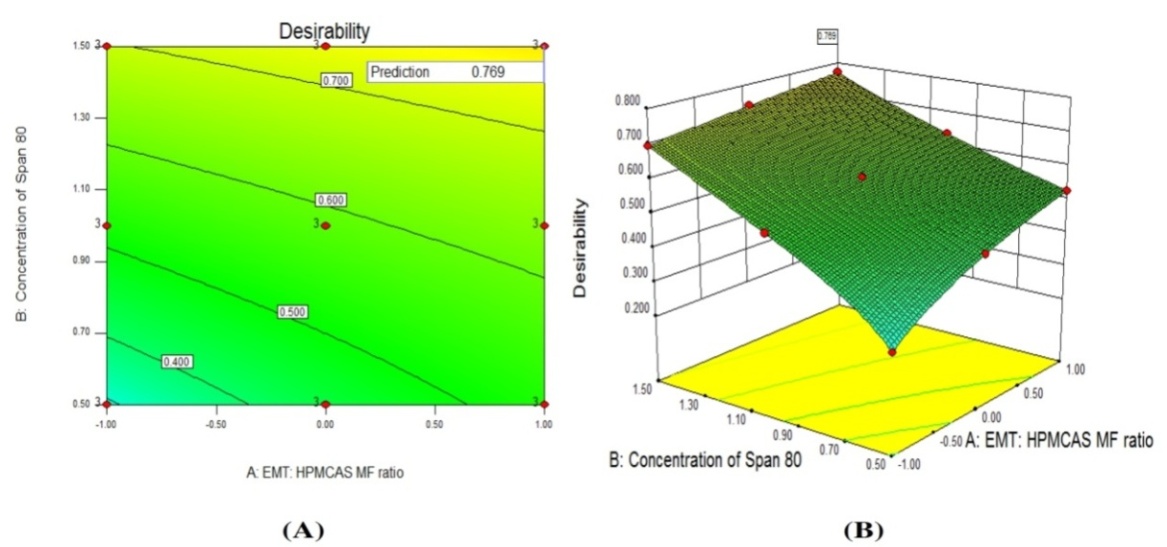 Fig. 5: (A) Contour plot and (B) 3D surface plot showing desirability of optimised batch