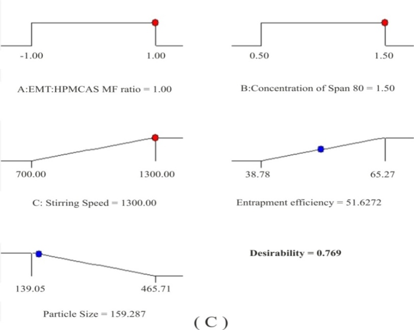 Fig. 5C shows the ramp display of parameters for interpretation of optimum solution parameters. A dot on each ramp reflects the factor setting or response prediction for that solution. The height of the dot shows the desirability of the process [35]. From the graph, the maximum desirability of 0.769 indicated that optimum formulation was achieved at 1:8 drug:polymer ratio, 1.5% w/w concentration of Span 80 and a stirring speed of 1300 rpm.