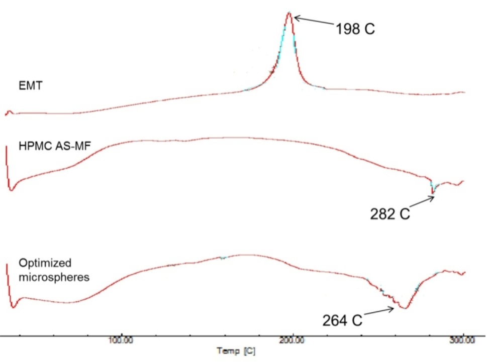 DSC analyses were carried out for EMT, HPMCAS MF and microspheres (fig. 6). Thermogram of EMT showed a sharp exothermic peak at 198 °C indicating its melting point. The thermogram for microspheres showed no event for EMT. The lowering of crystallinity of polymer was indicated by shifting of polymer peak towards lower temperature (282 °C to 264 °C). The results suggested that EMT loaded HPMCAS microspheres were composed of a homogeneous phase, in which the polymer presented a lower degree of crystallinity than the raw material and the drug was molecularly dispersed in the polymer [19, 36].
