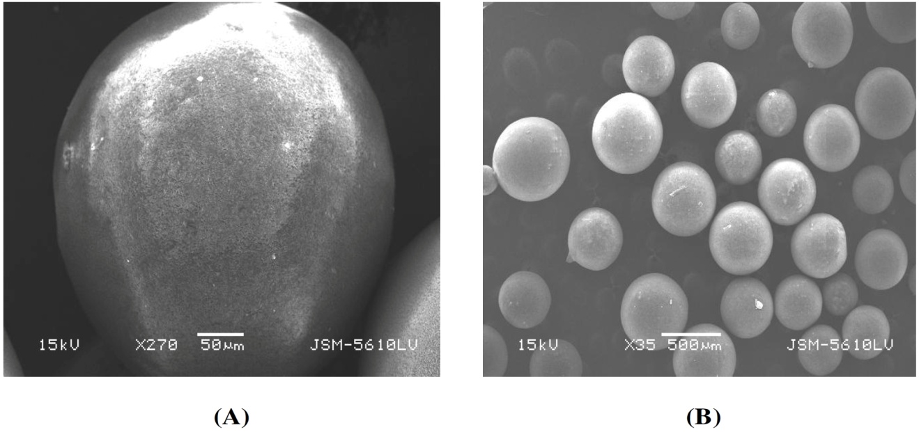 Surface morphology of microspheres was studied under a scanning electron microscope (JEOL, JSM 5760 LY). Samples were mounted on stubs and coated for 120 seconds with a layer of gold using a sputter coater (polaron SC 502). SEM photographs were taken at room temperature (25°C) using a low beam voltage of 20 kV [22].
