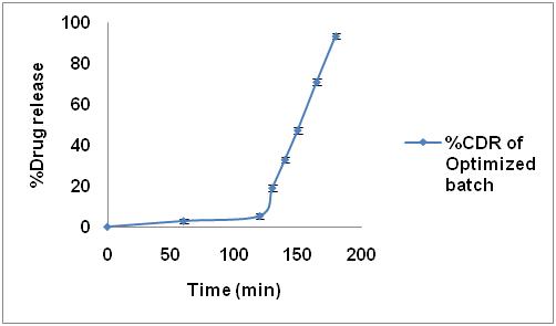 In vitro drug release profile of optimised batch showed that only 4.28±1.23% drug was released in acidic media after 120 min whereas 93.46±1.20% drug was released in the basic media after 60 min (fig. 8).