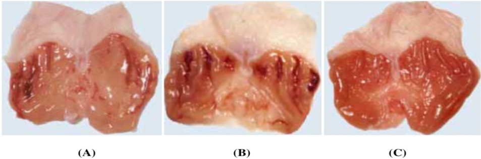Fig. 9: Photographs of the stomachs opened along the greater curvature in ethanol-induced ulcer rat model. (A) Stomach after administration of bicarbonate solution and (B) EMT solution [both showing the hemorrhagic lesions developed in the glandular portion of the stomach] (C) microspheres aqueous dispersion [no lesions observed]