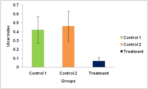 Fig. 10: Gastric ulcer indexes after administration of 42% sodium bicarbonate solution (Control 1), EMT solution (2 mg/ml) (Control 2) and EMT-loaded microspheres dispersion (Treatment) in ethanol-induced ulcer