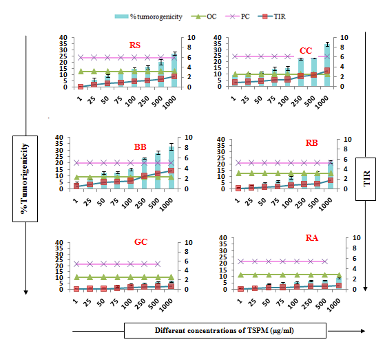 Tumor assay carried out to evaluate effects of particulate matter extracts revealed a dose-dependent tumor activity in all the studied samples (table 1). The extracts of particulate matter collected from crystal chowk have shown the maximum tumor activity (34.67±1.764) followed by Bhandari bridge (33.00±2.517) in terms of a number of tumors at the highest concentration used (1000 µg/ml). Tumor-inducing ration (TIR) for these sites was observed to be 3.25 and 3.54, respectively (table 2). The tumor induction was found to be in the order of Crystal chowk>Bhandari bridge>Railway station>Ram bag>Ranjit avenue> Garden colony. The tumor-inducing ratio was also found to be dose-dependent manner as depicted in fig. 1. Tumor, not being a phenomenon of normal cells, is an abrupt proliferation of cells which disrupts the neighbouring cells [14]. During this process, excessive proliferation occurs because of continuous supply of nutrients through newly formed channels (blood vessels) and other growth factors resulting in rapid multiplication of tumor cells. However, during crown gall disease of potato, the growth of the tumor is supported via nutrient agar medium resulting in its marked progression. As cancer growth factors are leading challenge for emerging oncologist to combat with this problem, crown gall tumor assay was widely used for assessing anti-angiogenesis activities of several plants/plant products and has exhibited significant results [14-16] It is well documented that some tumorigenic mechanism are similar in plants and animals [14, 17].