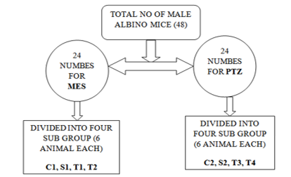 C1=Control group (0.25 ml of distilled water orally), S1= Standard group (50 mg/kg of phenytoin orally), T1= Test group (200 mg/kg of Centella asiatica orally), T2= Test group (400 mg/kg of Centella asiatica orally), C2= Control group (0.25 ml of distilled water orally)+Pentylenetetrazole (80 mg/kg subcutaneously), S2= Standard group (300 mg/kg of sodium valproate intraperitoneally)+Pentylenetetrazole (80 mg/kg subcutaneously), T3= Test group (200 mg/kg of Centella asiatica orally)+Pentylenetetrazole (80 mg/kg subcutaneously), T4= Test group (400 mg/kg of Centella asiatica orally)+Pentylenetetrazole (80 mg/kg subcutaneously).