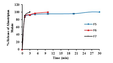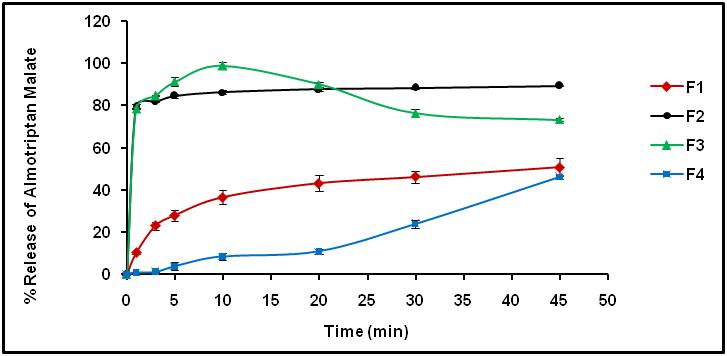 Fig. 1: Release profile of almotriptan malate from single polymer lyotab formulations. Each point represents the mean±SD (n = 3)