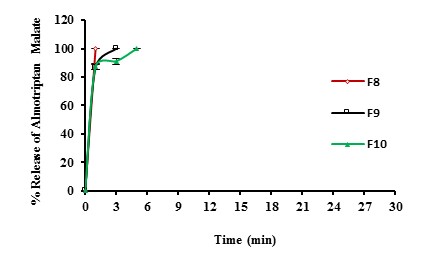 Concerning the characteristics of these Alm-lyotab formulations (table 2), the diameter for all formulations was 7.8 mm, their thickness ranged from 1.27-3.41 mm, average weight of 15.43-25.2 mg, % drug content from 98.87-101.42%. An elegant appearance with smooth surface well-formed lyotabs was observed in both F7 and F8 formulations. Other formulations exhibited rough surface, with some air bubbles. Clear variation in both in-vitro and in vivo disintegration time values was recognised. Although the European Pharmacopoeia describes orodispersible tablets as tablets which should disintegrate within 3 min, many critics find that a maximum disintegration time of 3 min for any tablet is too long and that the presence of a gritty tablet in the patient’s mouth for 3 min would be unpleasant and uncomfortable. According to the literature, the oral disintegration time of mouth-dissolved tablets is one minute or less, preferably about 30 s or less [37]. Also because Almo-lyotab was designed to be mainly absorbed in the sublingual area to be readily absorbed and exert its action promptly and also to bypass the gastrointestinal tract (GIT), it is necessary that the lyotab disintegrates within few seconds and rapidly dissolve so that most of the drug absorption takes place in the sublingual area before being swallowed. Upon illustration of the in vitro disintegration time of these formulations, we can observe that all formulations exhibited a very short disintegration time, ranged from 2.5-14 sec. The presence of the water-soluble polymer PVP in all formulations resulted in encouraging water pull inside the lyotabs with subsequent rapid disintegration and expected fast release rate. In one study, increasing the concentration of the PVP-k30 in oral lyophilizates of diclofenac sodium, resulted in negative effect. Although these formulations had fast disintegration time (less than 12 seconds), the formulas acquired incorrect appearance and multiple broken units [16]. Formulations containing 0.25% chitosan (F5-F7), showed a short in vitro disintegration time, ranged from 2.5-4.78 sec, whereas, those containing 0.5% chitosan (F8-F10), showed longer in vitro disintegration time, ranged from 4.78-9.21 sec. Increasing the chitosan concentration to 0.75% (F11-F13), led to a significant increase in in vitro disintegration time (11.64-14 sec). It is considered that chitosan might swell and form a gel owing to penetration of the dissolution medium. But upon increasing chitosan concentration to 0.75%, the gel structure became more stable and cohesive. Thus it may hinder more penetration of the dissolution medium which is necessary for further disintegration. It is worthy to note that, during lyotabs preparation, trying concentrations more than 0.75% of chitosan could not be applied due to the observed high viscosity of the formulation and difficulty of pouring into blisters.