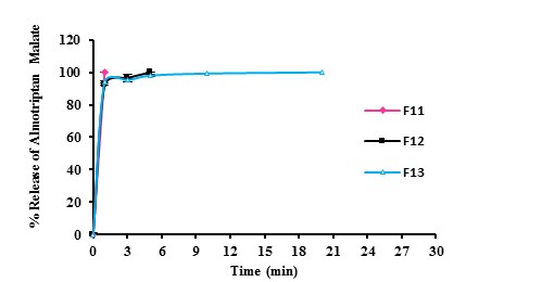 Fig. 2: Release profile of almotriptan malate from lyotab formulations, a) F5-F7, b) F8-F10, c) F11-F13. Each point represents the mean±SD (n = 3)