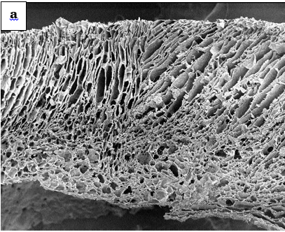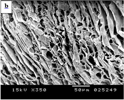 Fig. 3: Scanning electron micrographs of F8 Alm-lyotab formulation in cross-section view (a) and surface view (b)