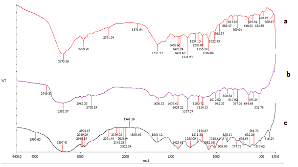 Fig. 4: FTIR spectra for a) Pure almotriptan malate, b) Formula F8, and c) Formula F8 physical mixture