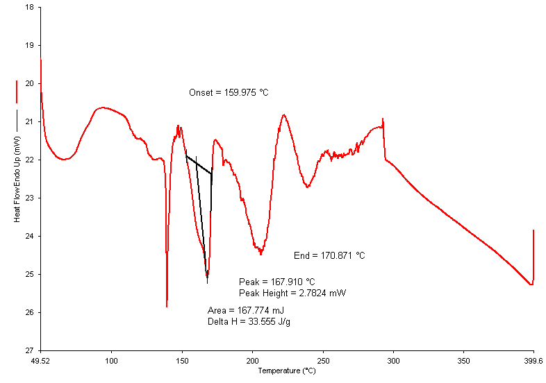No characteristic peak was observed at 166.3 °C, in the case of Alm-lyotab (F8), suggesting that almotriptan is molecularly dispersed in the matrix in an amorphous form produced by the process of lyophilization. The thermogram of the physical mixture showed a small endotherm corresponding to the melting point of the drug.
