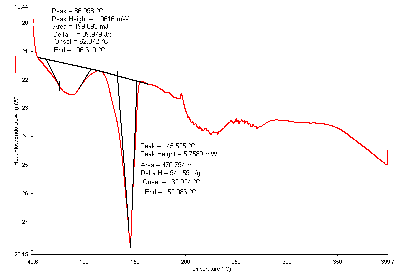 DSC thermograms of selected formula, individual components and physical mixture were recorded using a differential scanning calorimeter (Perkin Elmer, Germany). About 5 mg of sample was crimped in a standard aluminium pan and heated in a temperature range of 40 °C to 250 °C at a heating rate of 10 °C per minute in a nitrogen atmosphere.