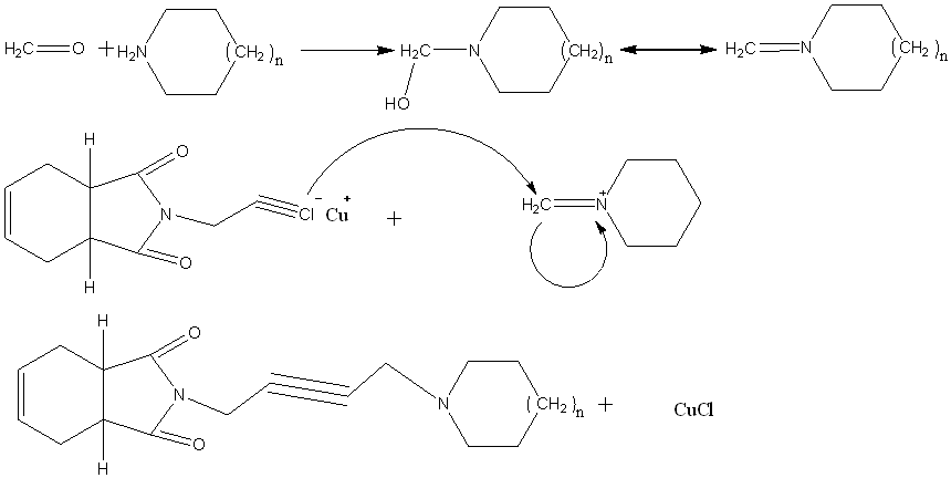 A mixture of 2-(prop-2-yn-1-yl)-2,3,3a,4,7,7a-hexahydro-1H-isoindole-1,3-dione (2 g), paraformaldehyde (0.5 g), cyclic amines (around 0.01 mol) and cuprous chloride catalytic amount (0.03 g), in peroxide-free dioxane 35 ml was refluxed for 1 h. filtered and evaporated under reduced pressure afforded compounds (AZ 1-6).
