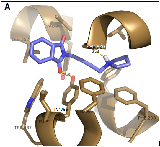Binding energies of the best-docked pose of all six compounds are shown in table 1, along with the flurbiprofen and celecoxib scoring as a reference. All compounds were seemed to fit well in the COX-1 as well as in the COX-2 active sites (they have favourable binding energies). Interestingly, AZ-6 had shown a remarkable binding energy (-8.6 kcal/mol) in the COX-1 active site, which was very close to the diclofenac’s binding energy (-8.7 kcal/mol). As shown in fig. 2. A, AZ-6 also possessed a similar binding mode as diclofenac where the best pose was seemed to fit in the COX-1 catalytic pocket pleasantly and to make the same hydrogen bonding interactions that were made by diclofenac. These interactions were made by ligand protonated amino group and a cyclic carbonyl group. Obviously, these interactions were assisted by the existence of the acetylenic group which acted as an anchor; via placing these two polar groups in the correct position for binding. In addition to these electrostatic interactions, extensive hydrophobic interactions were made between the ligand carbon atoms and the side chains of Tyr348, Val349, Le352, Phe381, Leu384, Trp387, and Leu534. Although AZ-6 obtained a very good score in the COX-2 active site. AZ-4 seemed to have the best affinity towards the enzyme active site. Fig. 2. B shows how AZ-4 nicely fitted in the COX-2 pocket, making many van der Waal contacts with the surrounding hydrophobic residues. In terms of electrostatics, interestingly, two unusual and strong hydrogen bonding interactions were made between the protonated nitrogen and the backbone amide of Leu352 and Ser353, and another weak hydrogen bond was made between the cyclic carbonyl group and the Ser530 side chain at the top of the catalytic pocket. The docking scores data (table 1) indicated a close similarity in the binding affinity to both COXs and may be more selective to COX-1 as in flurbiprofen. Colorimetric COXs (ovine/human) inhibition as shown in table 2 that compound AZ-5 showed the highest % of inhibition for COX-1 even better than aspirin, while no inhibition for COX-2, but rather stimulation.