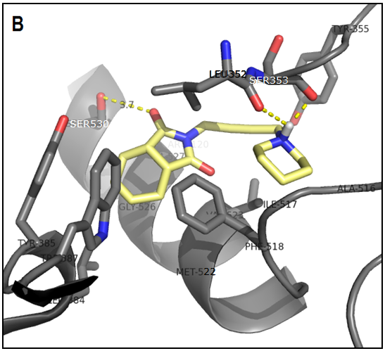 Fig. 6: (A) Shows the binding mode of AZ-6 (blue) within the COX-1 active site (gold). (B) Shows the binding mode AZ-4 (yellow) within the COX-2 active site (gray), respectively. Yellow dotted lines indicate for hydrogen bonding. The picture was generated by PyMol.[12] Some protein chains are not shown for clarity