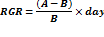 RGR = Relative Growth Rate, where A = weight of live insects on one day (mg)/number of live insects on one day. B = initial weight of insects (mg)/initial number of insects.