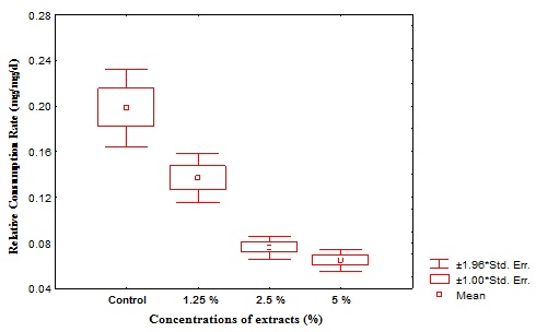 The highest concentration of the extract (5%) was also showing a similar effect. There was only a very slight increase in the RGR (0.027 mg/mg/d) (table 2). Similarly, relative consumption rate (RCR) also significantly decreased with increasing concentrations of the extract. With a concentration of 1.25% of the extract the control value of 0.169 mg/mg/d was reduced to 0.113 mg/mg/d, which was then reduced to 0.073 mg/mg/d with 2.5% of the VME.