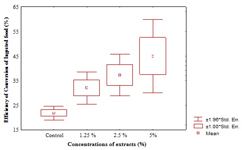 On the other hand, the percentage of efficiency of conversion of ingested food (ECI %) of the insects increased with an increase in the concentration of VPE. Higher ECI % was shown by 2.5% (ECI = 43%) and 5% (ECI = 41%) concentrations of the extract. Values of ECI calculated for a concentration of 1.25% of VPE was almost equal to the value (25%) obtained for the control (23%) (table 1).