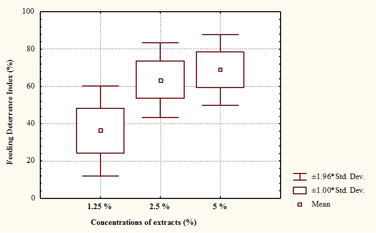 Antifeedant activity (feeding deterrence activity) was calculated as Feeding Deterrence Index (Isman et al., 1990) [13].