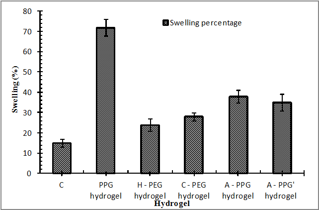 A-PPG hydrogel has a swelling percentage of 34.7% contained aloe-vera and keratin only. C-PEG hydrogel possesses 29.9% swelling capacity. PPG hydrogel can be applied to severe wounds that exudate abundantly whilst other hydrogels should be considered before apply.