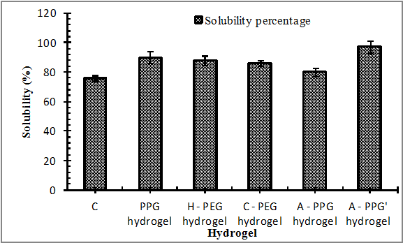 A-PPG hydrogel which consists of 10% of aloe-vera and 30% of keratin has the highest solubility as compared to other hydrogels. Overall, the formulated hydrogels are highly soluble in nature.