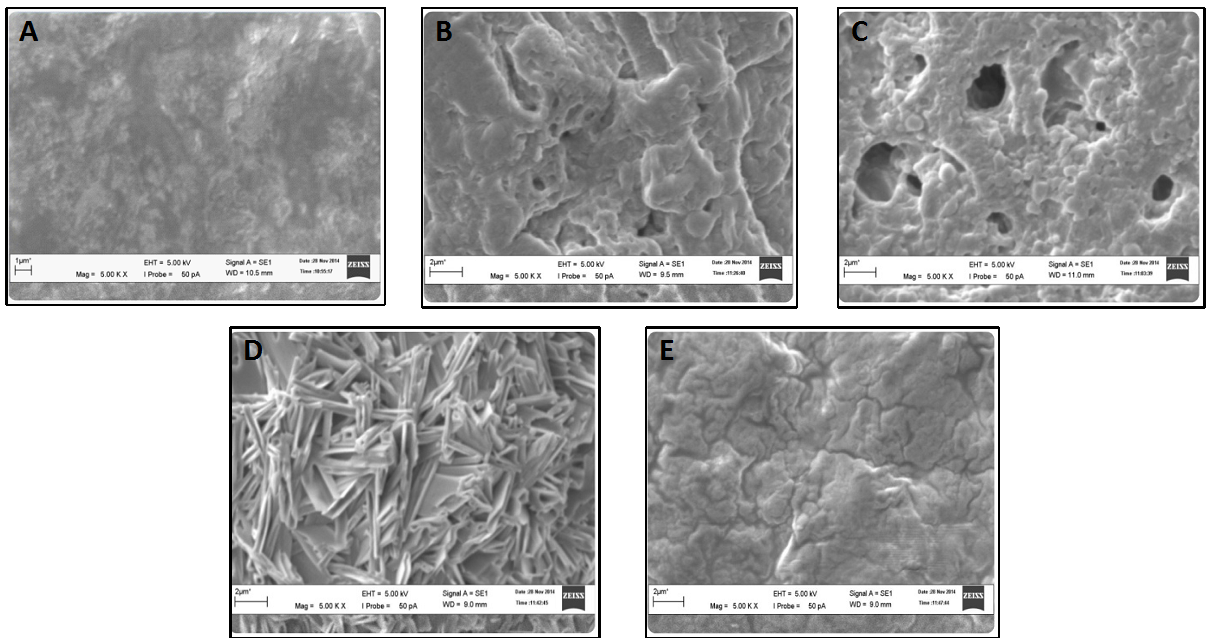Fig. 3: Topography of hydrogel at magnification of 5000x A) PPG hydrogel B) H-PEG hydrogel C) C-PEG hydrogel D) A-PPG hydrogel E) A-PPG' hydrogel