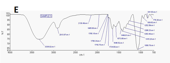 Fig. 4: IR Absorbance A) PPG hydrogel B) H-PEG hydrogel C) C-PEG hydrogel D) A-PPG hydrogel E) A-PPG' hydrogel