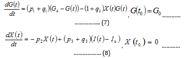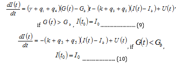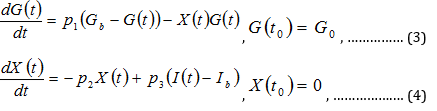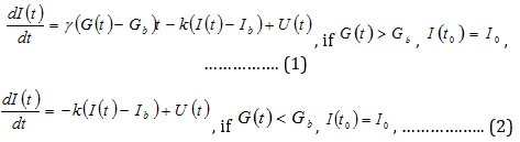 Where k [min-1] is the insulin clearance fraction, Gb [mg/dl] is the basal glucose level, γ [min-1] is a measure of the secondary pancreatic response to glucose, [μU/ml], u(t) [μU/kg body weight] stands for the exogenous insulin infusion rate and V [ml/kg] for the distribution volume.
