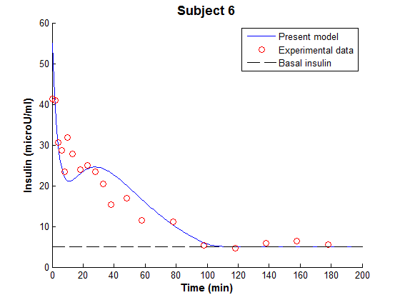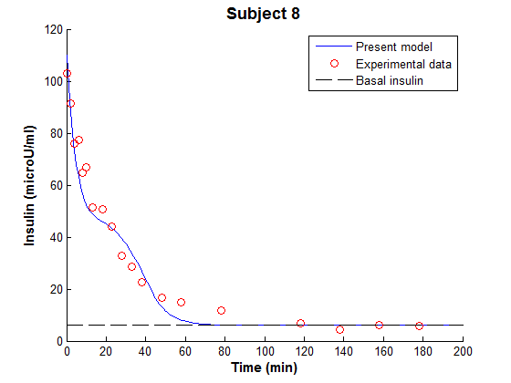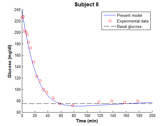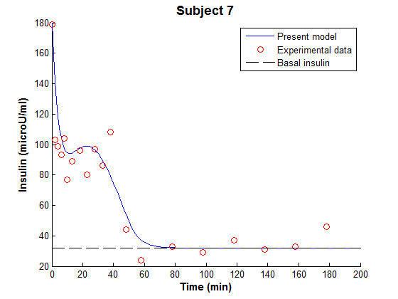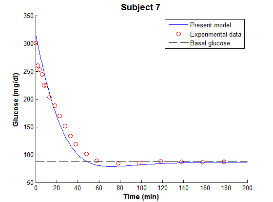 The fitting process combined with the modified MM took the glucose-insulin system as a dynamic integrated system and generates a set of real optimised model parameters of the experimental data.